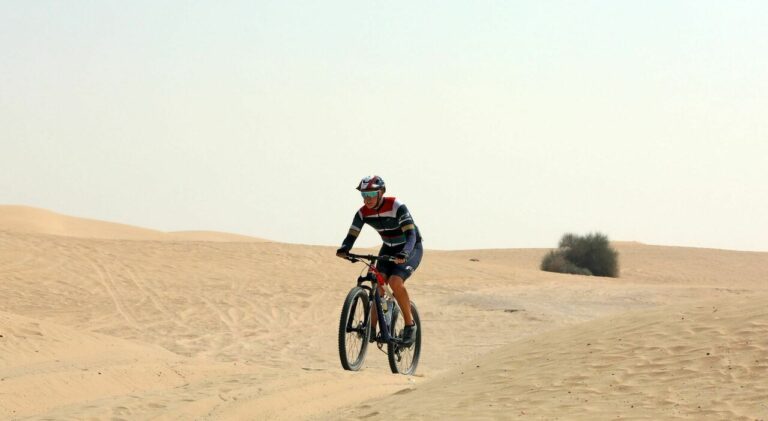 En selle sur son VTT, le Napolitain Nico de Corato, né en 1977, a traversé les Émirats Arabes Unis d'une...