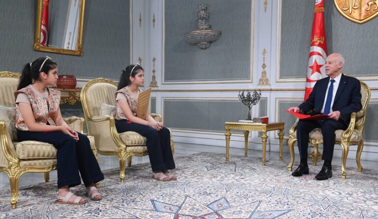 Kaïs Saïed félicite les sœurs Bissan et Bilsan Kouka, lauréates du « défi de la lecture arabe » à Dubaï...